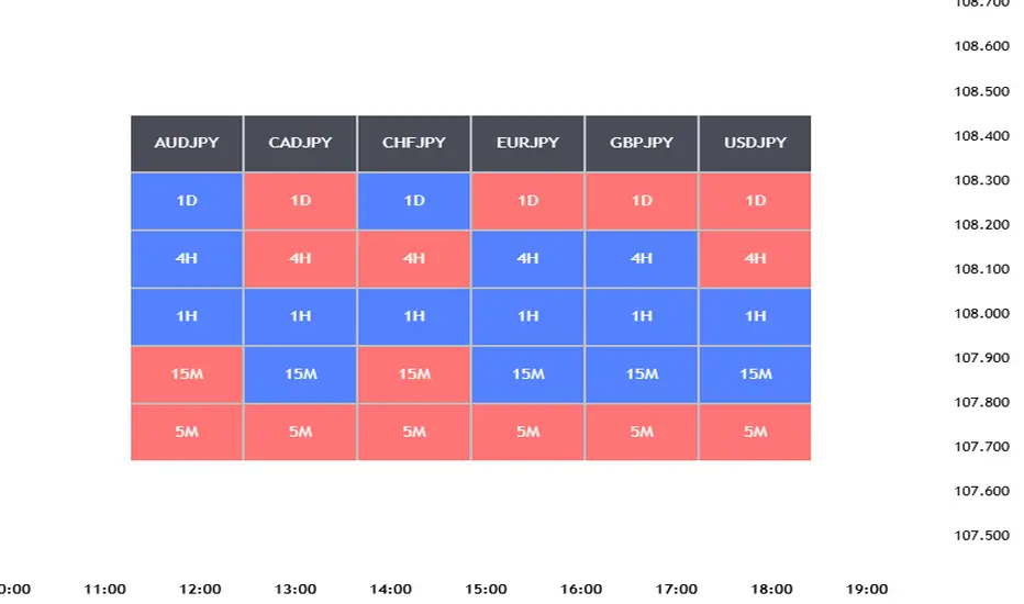 This script is an advanced MTF (multi-timeframe) monitor that combines the concepts of Dow Theory and SMA (Single Moving Average) to capture the moment when trends align across multiple timeframes. It is particularly focused on visualizing when lower timeframes synchronize with the direction of higher timeframes, without being distracted by short-term noise. 1. Trend Determination Mechanism (Core Logic): Rather than the usual simple determination of whether a price is above or below a moving average, this is based on updates of "low lows and highs." Pivot Detection: Points where the SMA moves in a "V" or "inverted V" shape are recorded as reversal candidates ($lastH$, $lastL$). Trend Reversal Conditions: Uptrend: When the price clearly breaks above the most recent SMA high ($lastH$). Downtrend: When the price clearly breaks below the most recent SMA low ($lastL$). 2. Indicator Features ① Sync Hierarchy: This script counts the degree to which the direction of each time period matches that of the higher time period, starting from the lower time period. The 5-minute time period forms a trend. The 15-minute time period follows the same direction as the 5-minute time period. The 1-hour time period follows the same direction as the 15-minute time period... (continues up to the daily time period). This ensures that an alert is sent out when the larger trend (daily or 4-hourly) swallows up the smaller trend (5-minute or 15-minute). ② Set Selection: You can switch between the "Yen Set (AUDJPY, EURJPY, etc.)" and the "Dollar Set (EURUSD, GBPUSD, etc.)." This allows you to grasp the strength or weakness of a specific currency (e.g., a weak yen or a strong dollar) at a glance.