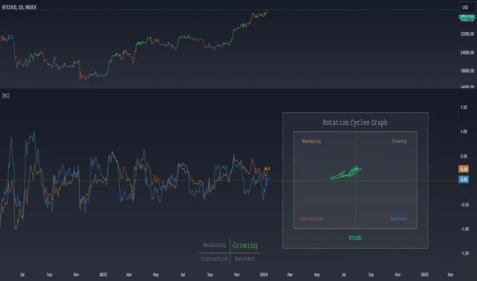 The Rotation Cycles Graph Indicator is designed to visualize rotation cycles in financial markets. It aims to provide insights into shifts between various market phases, including growth, weakening, recovery, and contraction, allowing traders to potentially identify changing market dynamics.