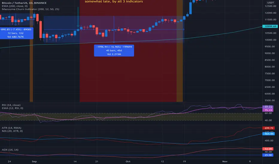 Because of the offset of the EMA 200, the precision of the Churn predictor can be off after a VERY big spike up or down, e.g. dec 2017. After such a spike use your common sense.