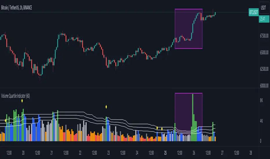 The Volume Quartile Indicator is a tool designed to analyze and classify trading volumes based on quartile levels, offering traders a visual means to assess market strength and momentum. This indicator calculates volume levels using a default length of 60 periods to determine the quartiles at 10%, 30%, 50%, 70%, and 90%. Each quartile range is represented by a specific color, providing a clear, visual representation of volume intensity relative to historical data.