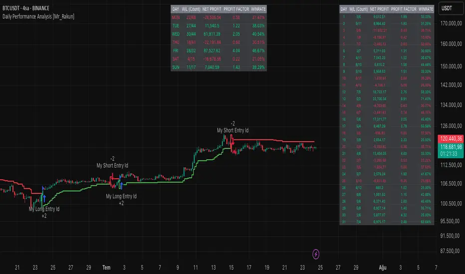 The Daily Performance Analysis indicator is a comprehensive trading performance tracker that analyzes your strategy's success rate and profitability across different days of the week and month. This powerful tool provides detailed statistics to help traders identify patterns in their trading performance and optimize their strategies accordingly.