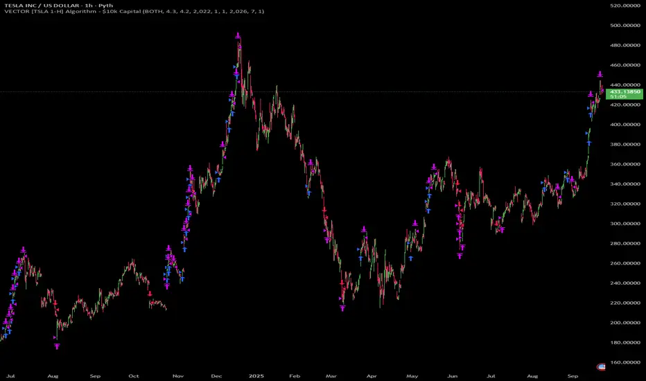 Vector Algos combines trend-following and mean-reversion logic - tuned for TSLA on the 1 H timeframe - to cut through market noise and distortion. By default our system: