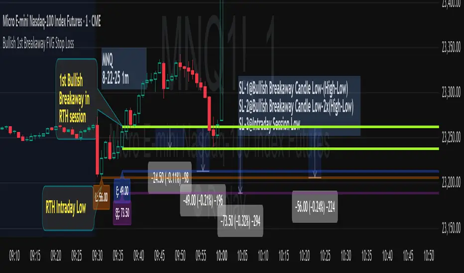 This indicator provides a defined 3-tier stop loss placement when you want to trade the 1st Bullish Breakaway FVG strategy. The Bullish Breakaway Dual Session FVG indicator is an independent indicator that track all bullish breakaway candles, however this one only tracks the very 1st breakaway candle with a stop loss visual cue.