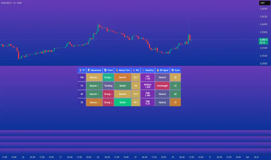 This is an advanced multi-timeframe technical analysis dashboard designed specifically for cryptocurrency trading. Unlike basic indicators, this script combines 8 essential metrics into a single visual table, providing a 360º market overview across 4 simultaneous timeframes.