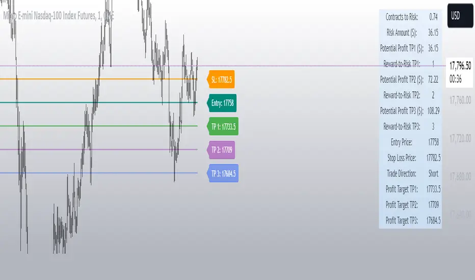 Enter your updated account size, risk percentage, and dollars per point in the script settings. Specify entry and stop-loss prices to calculate the optimal number of contracts to risk.