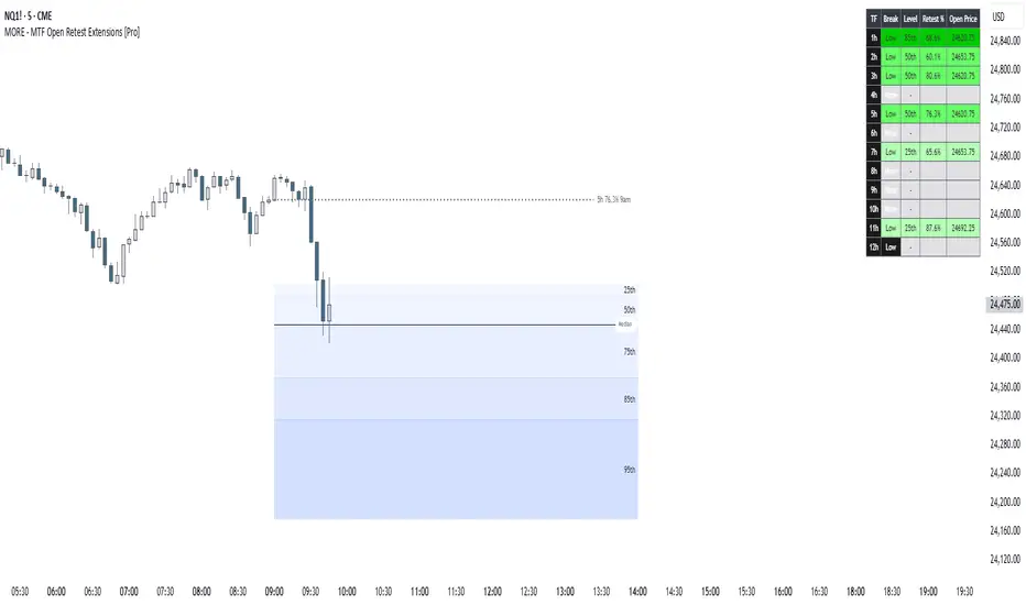 MORE- MTF Open Retest Extensions [Pro] highlights what price typically does after a higher-timeframe structure break (taking out the previous candle’s high or low) and before a potential retest of the current open.