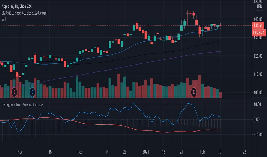 Simple script to monitor the difference between closing price and sma(20), sma(20) and sma(60), sma(60) and sma(120). The zero axis provides times when the moving average converge.