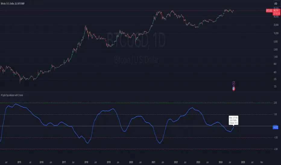 This Indicator Z-scores the Pi Cycle Top Indicator by first calculating two moving averages: the 111-day moving average (111DMA) and the 350-day moving average (350DMA) of the closing price. Then, the double of the 350-day moving average (350DMAx2) is calculated.