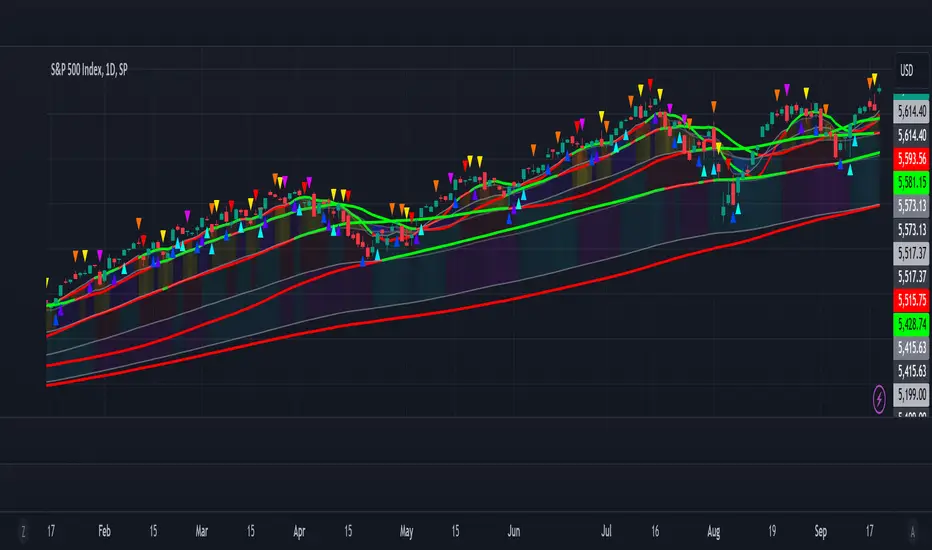 Reactive Gradient Clouds: Dynamically color-coded clouds that visualize momentum shifts using Stochastic, RSI, MACD, and Chande Momentum. These clouds help to react faster to price changes and confirm trends: