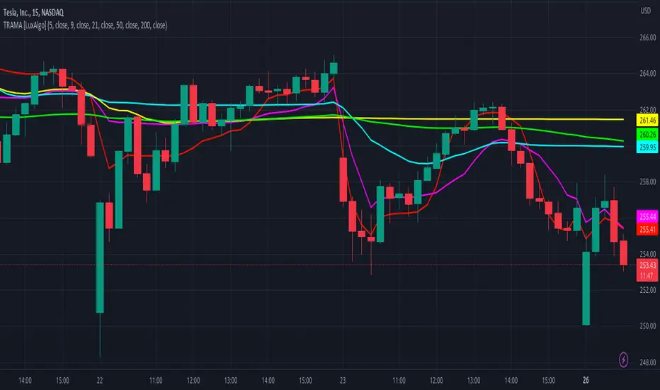 This indicator is based on the original TRAMA Indicator by LuxAlgo, but plots 5 of the TRAMA lines at once.
