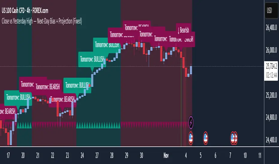 Close vs Yesterday High — Next-Day Bias + Projection