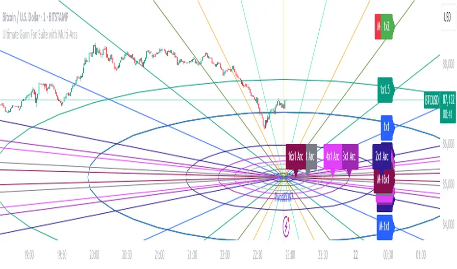 This open-source indicator plots Gann Fan angles, arcs, and levels to analyze price and time relationships based on a user-selected pivot point.