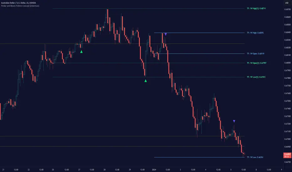 The Precision PinBar and Bloom Pattern Concept by Zeiierman introduces two new patterns, which we call the Bloom Pattern and the Precision PinBar Pattern. These patterns are used in conjunction with market open, high, and low values from different periods and timeframes. Together, they form the basis of the "PinBar and Bloom Pattern Concept." The main idea is to identify key bullish and bearish candlestick patterns around key levels plotted on the chart.