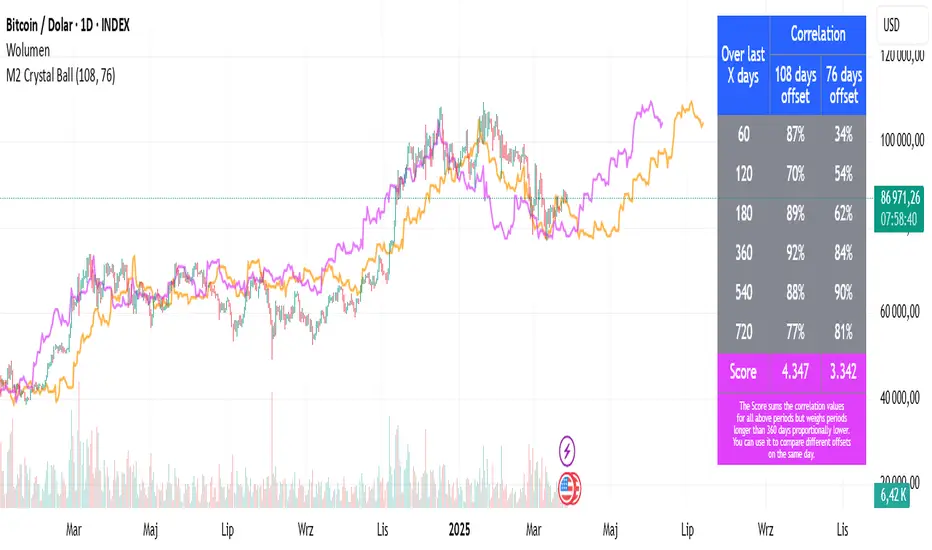 The M2 Crystal Ball allows you to plot and experiment with global M2 money supply shifted "into the future" to see if it correlates with your symbol and potentially predicts its future movements.