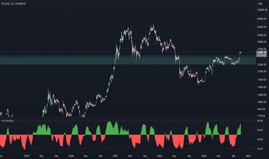 This indicator is constructed using the logarithmic returns of a price series and computing its standard deviation to estimate volatility. It then uses this volatility estimate to produce levels above and below the current price. It concludes by calculating the stochastic value based on these volatility levels.