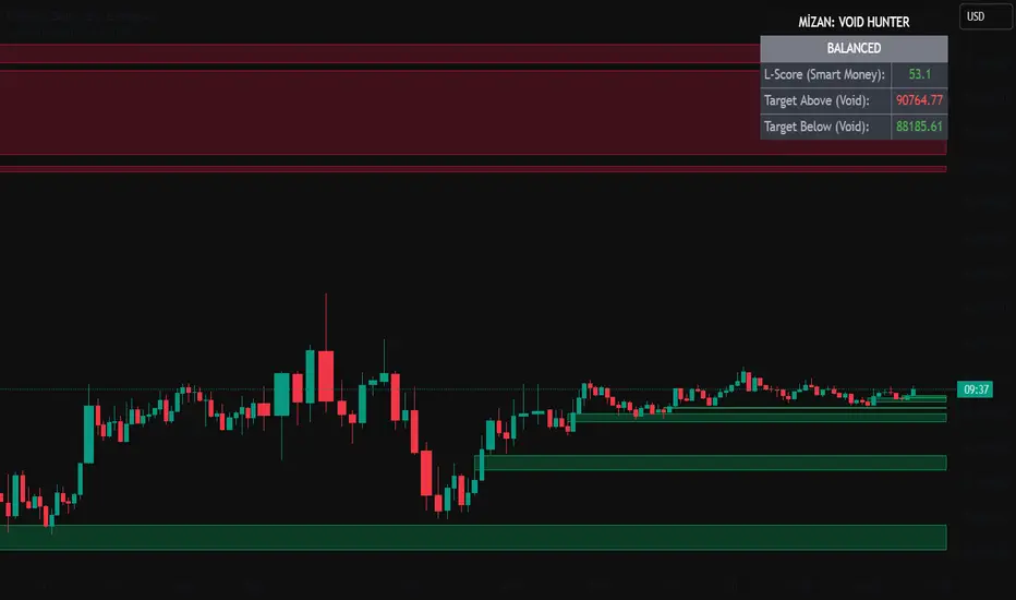 Overview: Mizan v12 is an advanced market structure tool that identifies Liquidity Voids (Fair Value Gaps) and uses a proprietary L-Score Engine to predict price reversion or continuation. Based on the philosophy of "Ontological Potential," it assumes that unfilled gaps act as magnets, pulling the price toward areas where market orders were not fully realized.