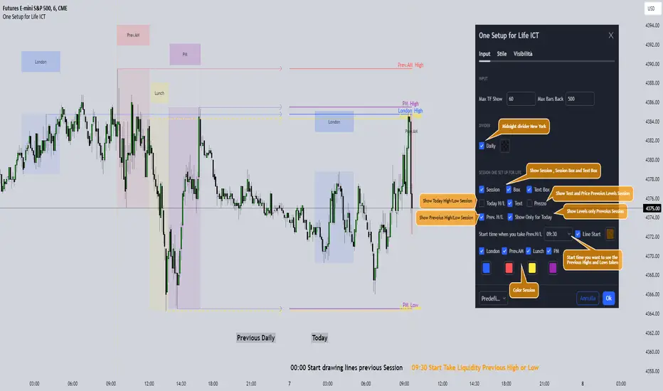 The indicator must be used as ICT shows in its concepts, the indicator takes into consideration both previous sessions and today's sessions, and the session levels can be used both for a reversal and for a possible Take Profit like the example here under