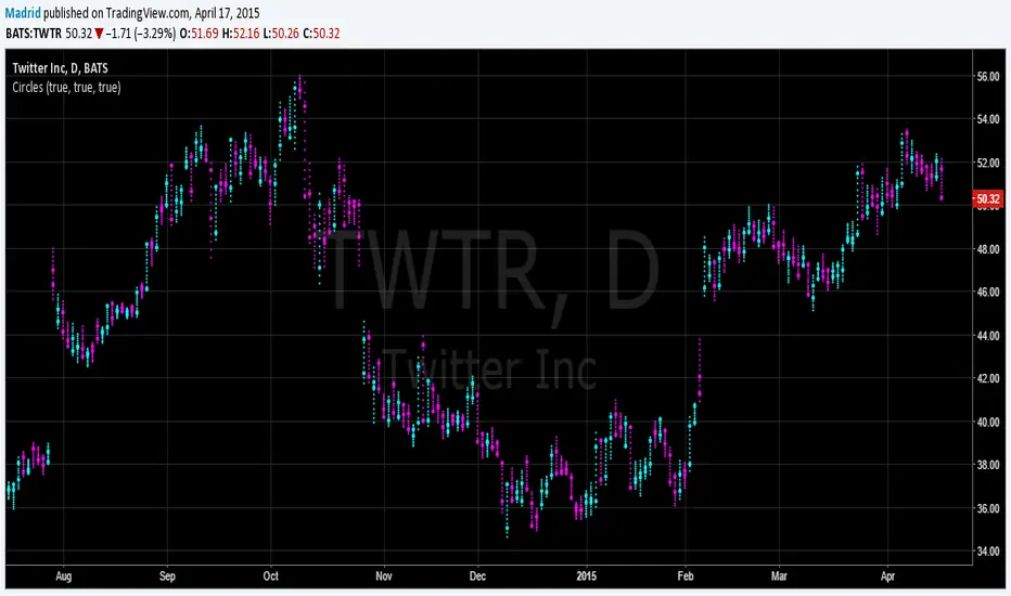 This displays the closing price colored according to the closing direction. This study is a different and versatile way to present the bars, it can show only the closing level, just the opening price, the full bar range or any combination of these three elements.