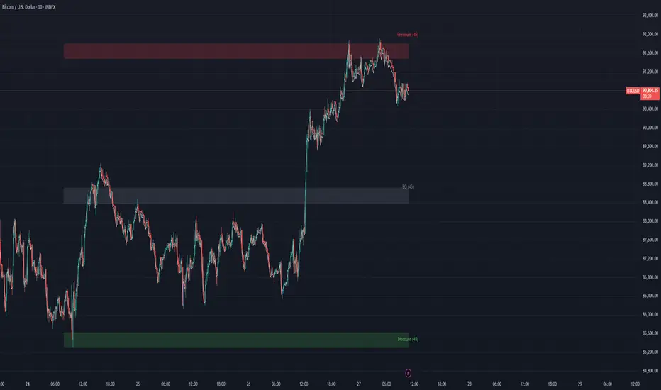 This indicator plots Premium, Equilibrium, and Discount zones based on any timeframe you choose.
