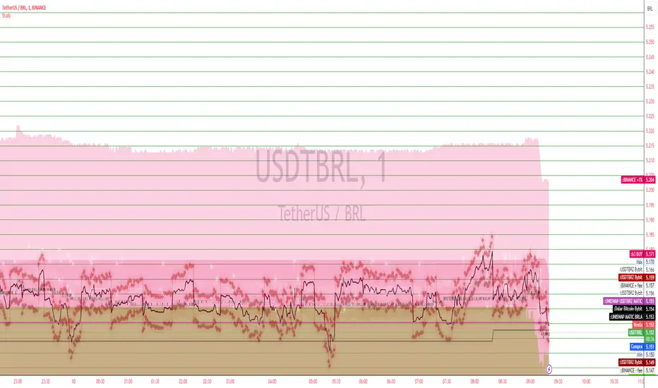 The script is designed to visualize and analyze discrepancies in the exchange rates of USDT to BRL (Tether to Brazilian Real) and USDT to BRZ (Tether to Brazilian Digital Token) across various trading platforms. It fetches the closing prices of multiple trading pairs from different platforms like Bybit, Binance, and Uniswap. The primary focus is to calculate and plot the conversion rate of BTCBRZ (Bitcoin to Brazilian Real) to USD. Additionally, the script highlights the differences in buy and sell rates for USDT-BRL and USDT-BRZ pairs, including fees and percentage adjustments. Visual elements like lines and areas are used to represent these rates, offering a comprehensive view of potential arbitrage opportunities in the Bitcoin market across different exchanges.