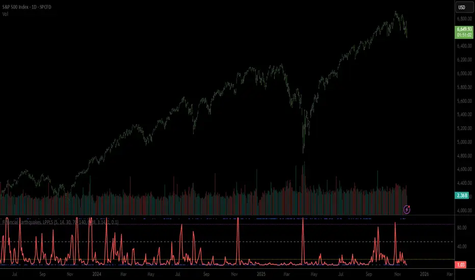 Sornette (ETH Zurich) pioneered the Log-Periodic Power Law Singularity (LPPLS) model, drawing a profound analogy between financial crashes and physical ruptures/earthquakes. In this framework, speculative bubbles exhibit super-exponential price growth (power-law acceleration toward a critical time tₚ) decorated by accelerating log-periodic oscillations — signatures of herding behavior and hierarchical feedback loops among investors. These "financial earthquakes" often end in regime changes: crashes (positive bubbles) or sharp rebounds (negative bubbles). This indicator provides a practical adaptation of Sornette's core ideas, without requiring complex nonlinear fitting on rolling windows.
