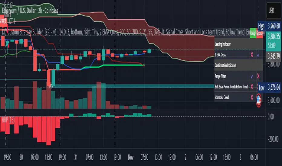 DIY Custom Strategy Builder [ZP] + eb8– v1 is a modular, “build-it-your-way” framework for creating and testing rule-based strategies directly on the chart. Instead of hard-coding one fixed system, it lets you pick a leading signal engine and then stack multiple confirmation filters and overlays around it, so you can prototype and refine your own trading logic without touching code.