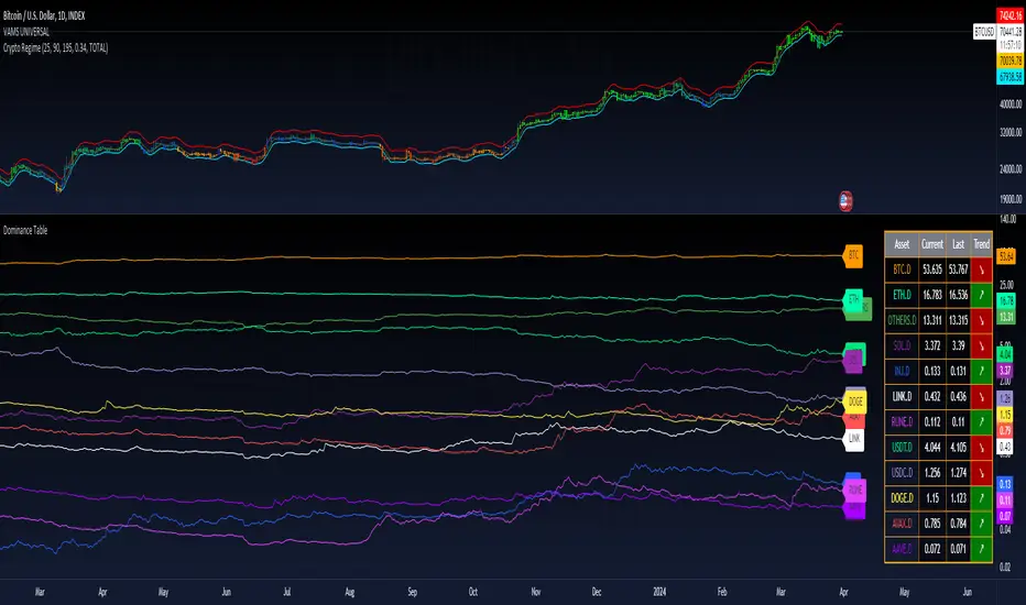 This indicator displays a table containing the current and previous dominance values for assets such as BTC, ETH, SOL, DOGE, and more, along with a math comparison to identify whether dominance is trending up or down.