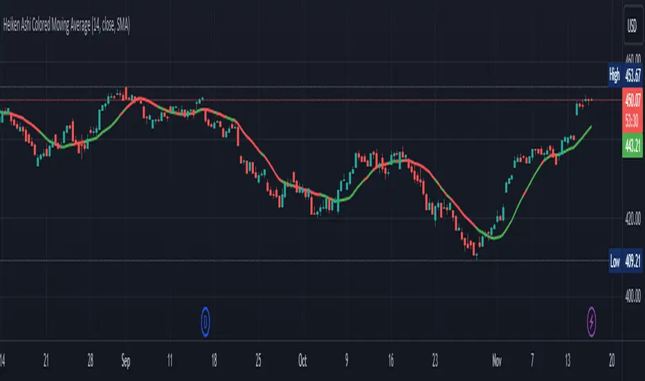 This indicator is meant to plot a moving average but the color of the moving average will change based on Heikin Ashi. Its seems to be slightly off, I would love any suggestions on improving this indicator.