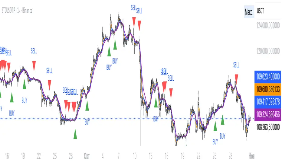 Adjustable settings: MA type (SMA/EMA/WMA/VWMA), MA periods, cloud on/off, show signals, minimum distance threshold.