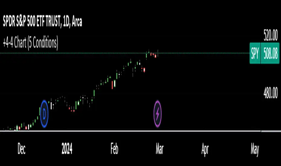 How to Use: The +4-4 Chart Indicator can be helpful in identifying potential trend continuation patterns, reversals, or periods of consolidation. Traders might use the predominance of green or red to gauge overall market sentiment. It is most useful to visualise long term daily, weekly, monthly market trends for SPY and QQQ etc.