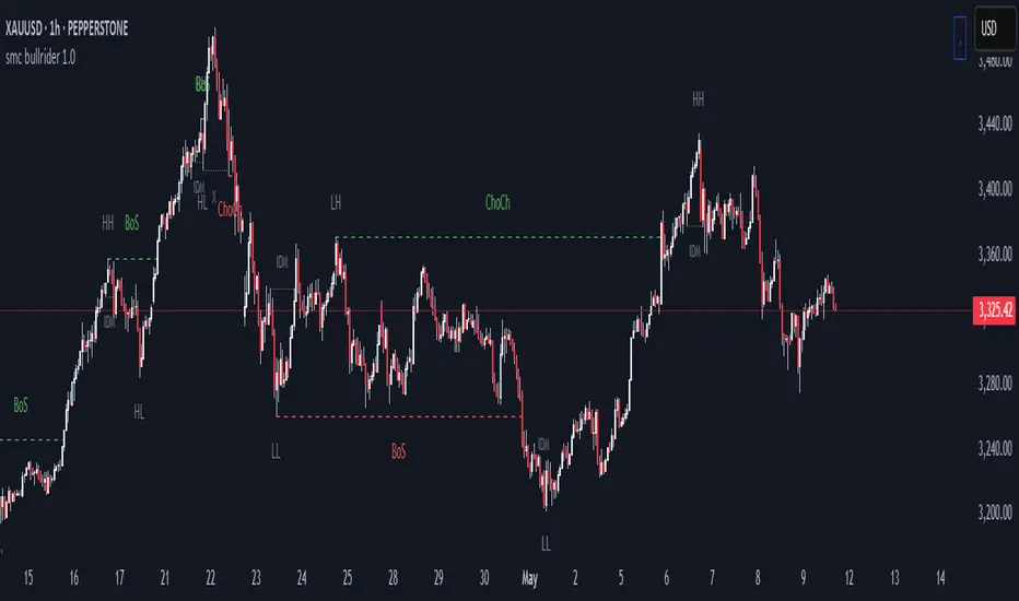 The smc bullrider 1.0 indicator is specifically crafted for mapping market structures. It excels in clearly recognizing type of Points Of Interest (SCOB) offering traders a straightforward and effective method to analyze market movements. It helps identify strategic entry points with precision.