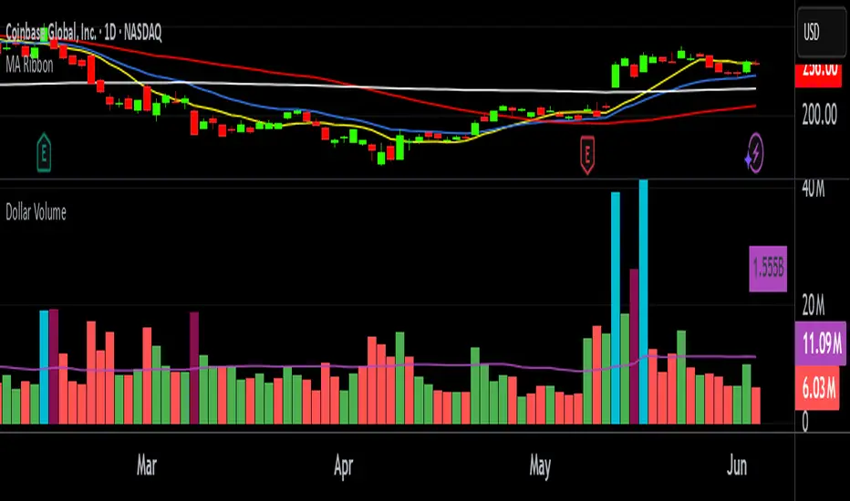 The Dollar Volume indicator enhances traditional volume analysis by showing not only the number of shares traded, but also the actual capital exchanged per bar. Using the formula