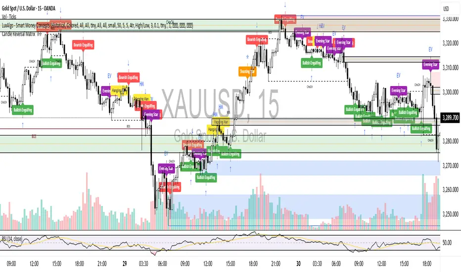 This "Engulfing + Shooting Star + Evening Star + Hanging Man + Dark Cloud Cover" indicator is a comprehensive candlestick pattern scanner designed to identify key bearish and bullish reversal signals on your TradingView charts.