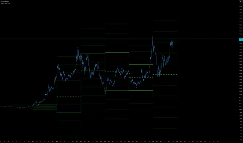 - Yearly ranges often cannot display correctly on low timeframes (e.g. 1h) because of TradingView’s maximum bar limits — for instance, five years of 1h data exceeds 40,000 bars. Use higher TFs for accurate rendering.