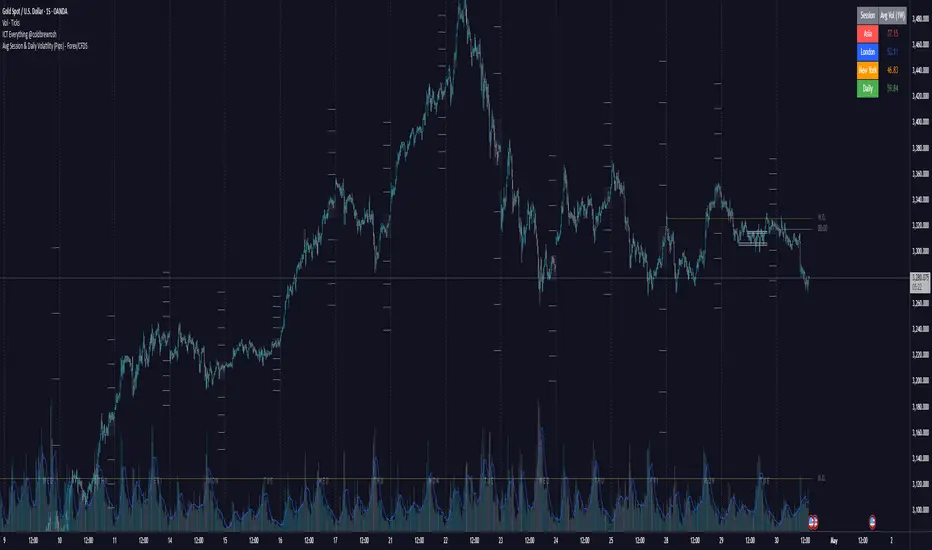 The Avg Session & Daily Volatility (Pips) indicator measures the average High–Low range (volatility) of three major Forex sessions—Asia, London, New York—and the entire trading day, then displays the results in a compact overlay table.