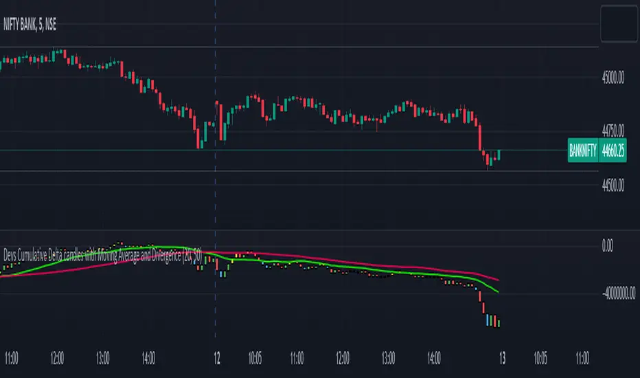 Devs Cumulative Delta candles with Moving Average and Divergence