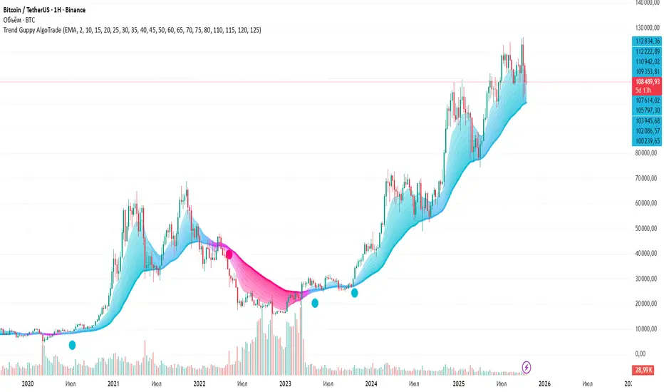 **Trend Guppy AlgoTrade** is an enhanced version of the classic Guppy Multiple Moving Average (GMMA) indicator, specifically optimized for algorithmic trading and early trend detection. This indicator uses 9 moving averages to identify trend direction and provides precise entry/exit signals with smooth gradient color transitions.