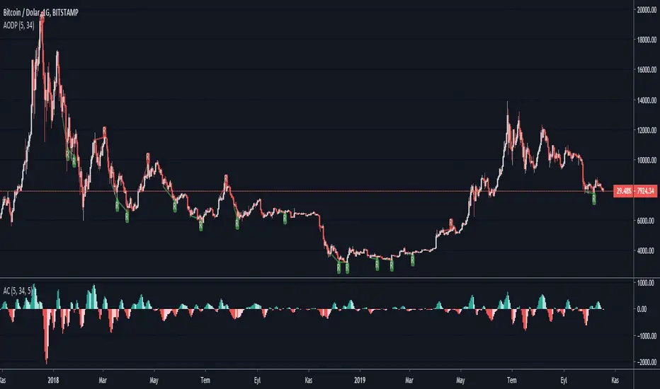 This script points regular and optionally hidden types of bullish and bearish Accelerator Oscillator divergences on the chart by drawing the divergence lines and optionally labels.