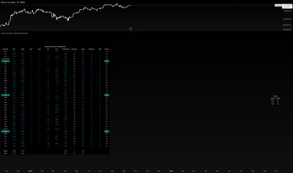This screener is an advanced tool designed to help crypto investors identify the strongest-performing altcoins among a custom selection of up to 40 assets. It evaluates multiple factors across trend strength, momentum, relative performance, and risk-adjusted returns โ then allocates a portfolio accordingly.