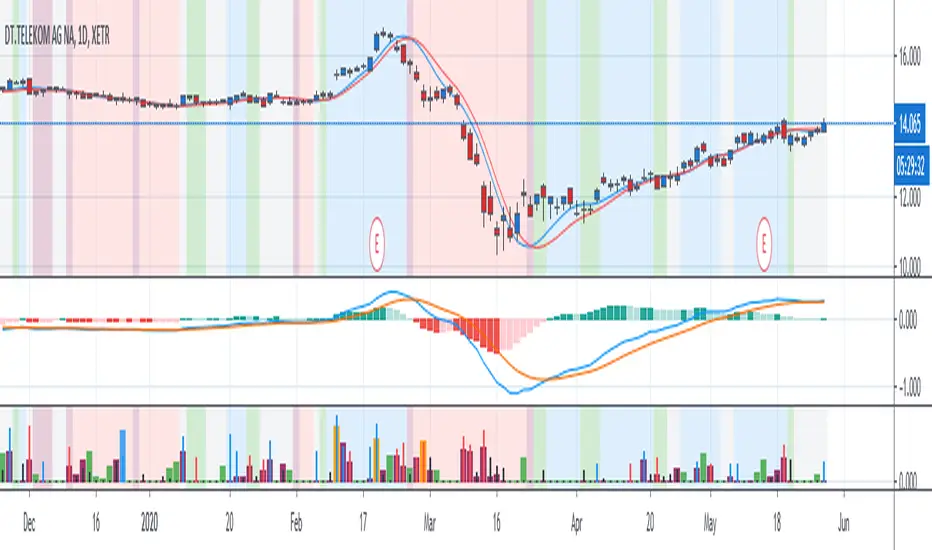 The idea for this script came when I studied how the Hull moving average should be used in trading, where I saw someone who used two HMA's, a longer and a shorter one, in a system in which he only placed an order if these agree on direction. This way he could pause trading when there is no direction (sideways movement). I look for a way to analyse range extensions in combination with volume expansions in combination with change of momentum. The idea is to depict momentum as a background color in this new indicator, called REVE, which I wil publish too. The purpose of this script is to show how the background colors are calculated and give users of the REVE a posibilty to tweak the length of the short and long HMA and to verify in the main panel of the chart that the colors are actually meaningful. To show how accurate this works I also put a MACD and the REVE in the sub panels of the example chart