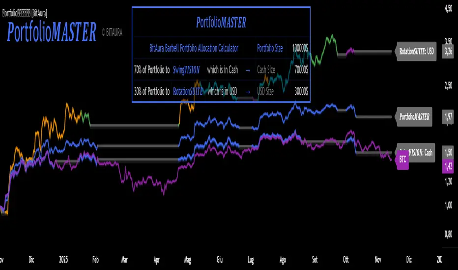 This Pine Scriptยฎ indicator is meant to be used to manage a Barbell Portfolio composed of BitAura's various strategies in order to create a risk-reward balance for the investor's needs. The Portfolio is divided in two main parts, one being a lower-risk Bitcoin-only strategy while the other being the higher-risk, higher-reward ๐otation๐บ๐ผ๐ฐ๐ป๐ฌ V3 system. The user can choose the percentage splits between these two systems and then also configure them based on their risk profile.