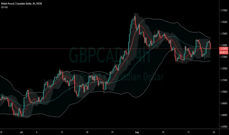A mixture of A Bollinger and fork from Ricardo Santos Donchian/Bollinger(DBH). Looks Nicer on a higher time frame, 4hr+. Default of DBH is 20, but 13/15 looks clearer to me.