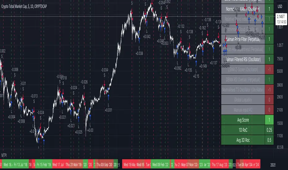 Highly Adjustable MTPI utilizing custom indicator library.Each indicator can be Enabled or Disabled, plotted as a line on a chart, as individual signals or as a background color overlay for easy adjustments.