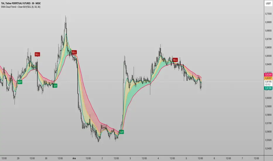 • Outer cloud (EMA 18 – EMA 36): Green (bullish) or Red (bearish) with 70% transparency