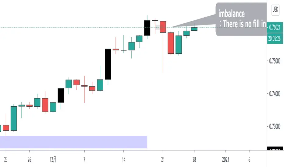 3つの連続するローソクのうち、1つ目と3つ目のヒゲからヒゲの間が埋まっていない状態をインバランスという。