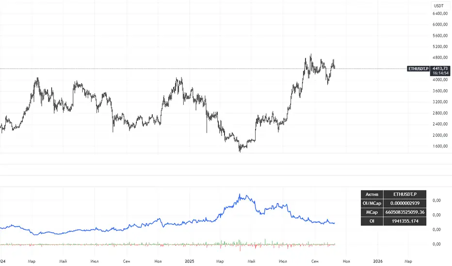 The indicator calculates the ratio of Open Interest (OI) of a futures contract to the market capitalization (Market Cap) of the spot asset. OI is the number of open (unclosed) futures positions in the market, expressed in contracts. Market Cap is the total value of the asset (price * circulating supply). The ratio shows how "overheated" or "interesting" the futures market is relative to the size of the asset.This is not a direct trading signal, but a tool for analyzing liquidity, speculation, and market sentiment.
