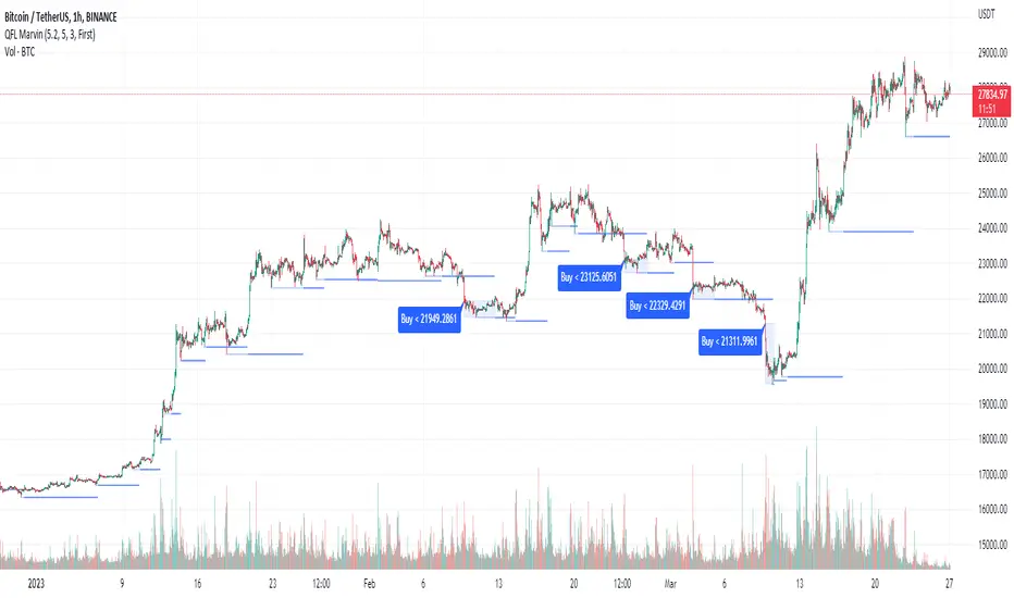 The script identifies QFL bases and buy signals and marks them on the price chart. These are able to be turned on and off in the script settings. The settings also allow the user to turn on plots for peaks, lowest lows and highest highs. These are not useful for applying the QFL trading strategy, but are calculations used in finding bases and can be useful for the user to understand what the script is doing in the background.