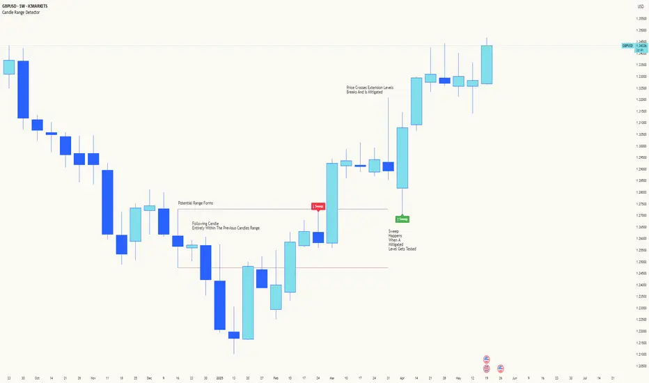 This indicator automatically detects price ranges based on candle containment, then tracks when those ranges are mitigated (broken) and when a sweep occurs. It is designed for traders who want to identify liquidity events and range breaks with precision.