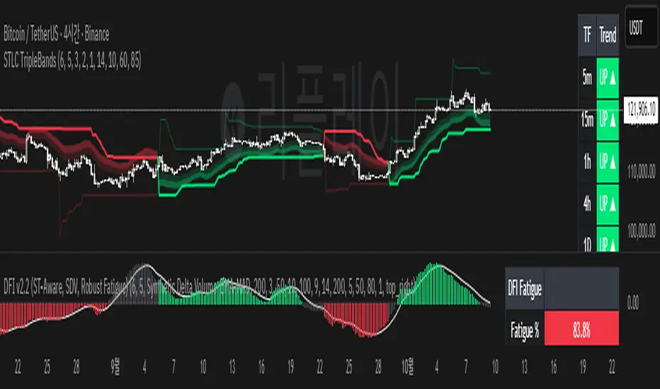 - 상승/하락 에너지를 각각 추적 (abs_up, abs_dn)하고, SuperTrend 또는 DFI 부호에 따라 해당 방향 피로만 계산.