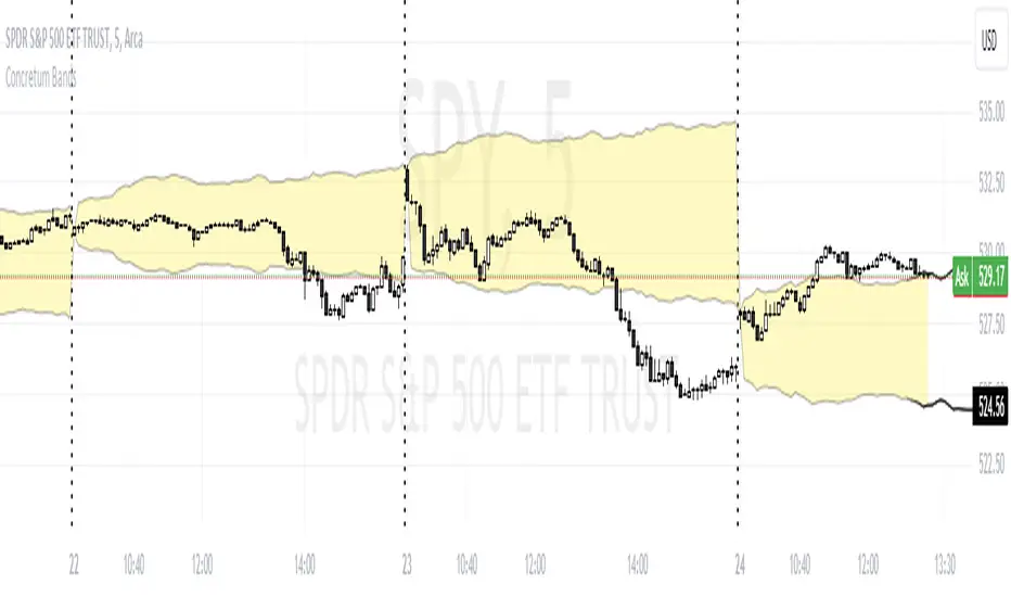 The Concretum Bands indicator recreates the Upper and Lower Bound of the Noise Area described in the paper "Beat the Market: An Effective Intraday Momentum Strategy for S&P500 ETF (SPY)" published by Concretum founder Zarattini, along with Barbon and Aziz, in May 2024.